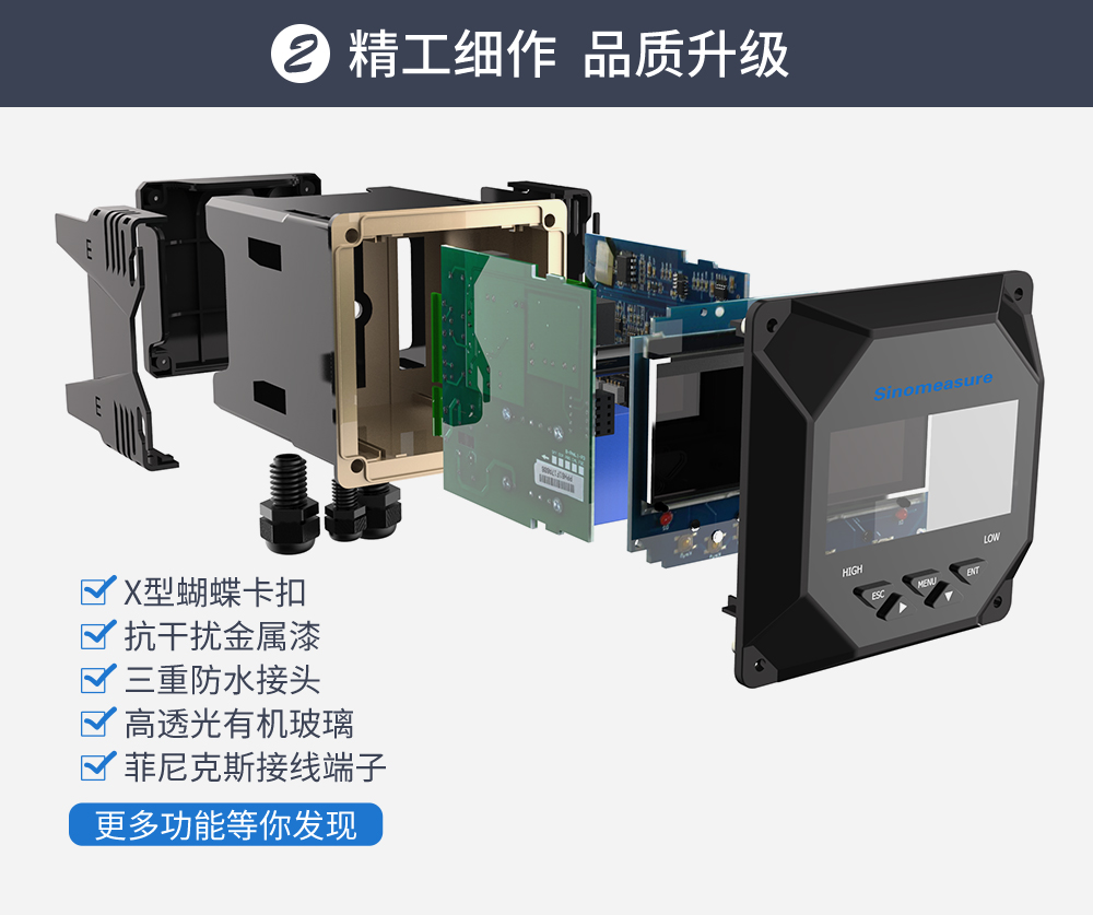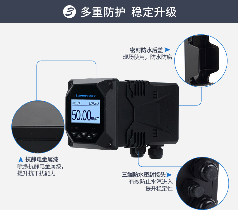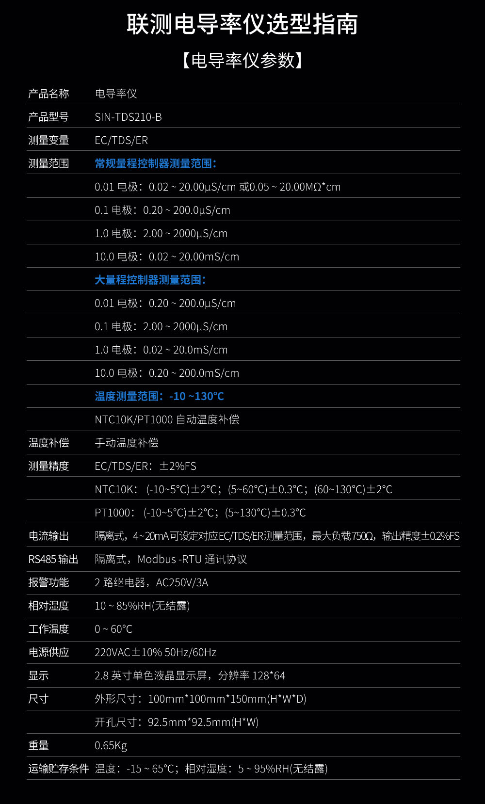 在線電導率儀是新一代全中文微機型儀表,具有全中文顯示、中文菜單式操作、全智能、多功能、測量性能高、環境適應性強等特點。二次表配上常數為1.0或10的電極可測量一般液體的電導率;配上0.1或0.01的電極,能準確測量純水的電導率,特別適用于電廠鍋爐給水和蒸汽冷凝水等高純水電導率的在線連續監測。 聯測_SIN-TDS210-B在線電導率儀 EC儀 TDS 電鍍行業、污水、循環水等檢測_