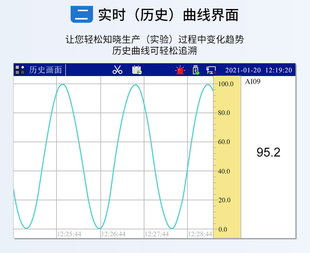 觸摸式彩色無紙記錄儀具有 60 個運算函數、24 路模擬量輸入、3 路 開關量輸入、3 路脈沖量輸入、6 路模擬量變送輸出、16 路開關量輸出, 可實現運算、顯示、記錄、報警、分析統計報表、高速采樣等功能,通 過 RS-232/RS-485 和以太網通訊接口,可實現遠程實時監控、組態管理、 歷史數據讀取等功能,通過 U 盤可實現組態管理、監控畫面管理和歷史 數據管理等功能。 觸摸式彩色無紙記錄儀采用 7 英寸觸摸式液晶屏作為顯示和操作界 面,前方面板防護等級符合 IP65 的要求。